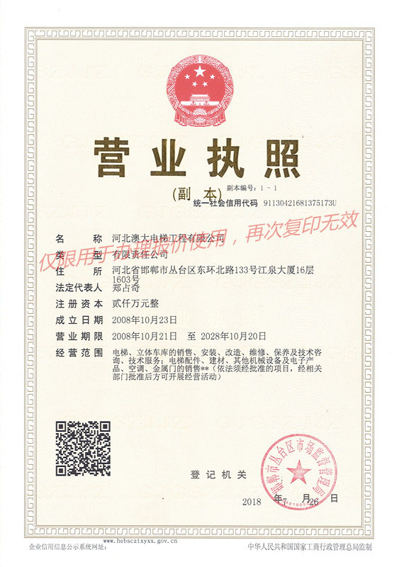 河北澳大電梯工程有限公司是集電梯銷售、安裝、維護(hù)保養(yǎng)為一體的專業(yè)化電梯公司。公司具有國家質(zhì)量監(jiān)督檢驗(yàn)總局頒發(fā)的“電梯安裝改造維修A級”資質(zhì)許可證。下設(shè)市場部、工程部、維保部、技術(shù)部、行政部及電梯配件公司。